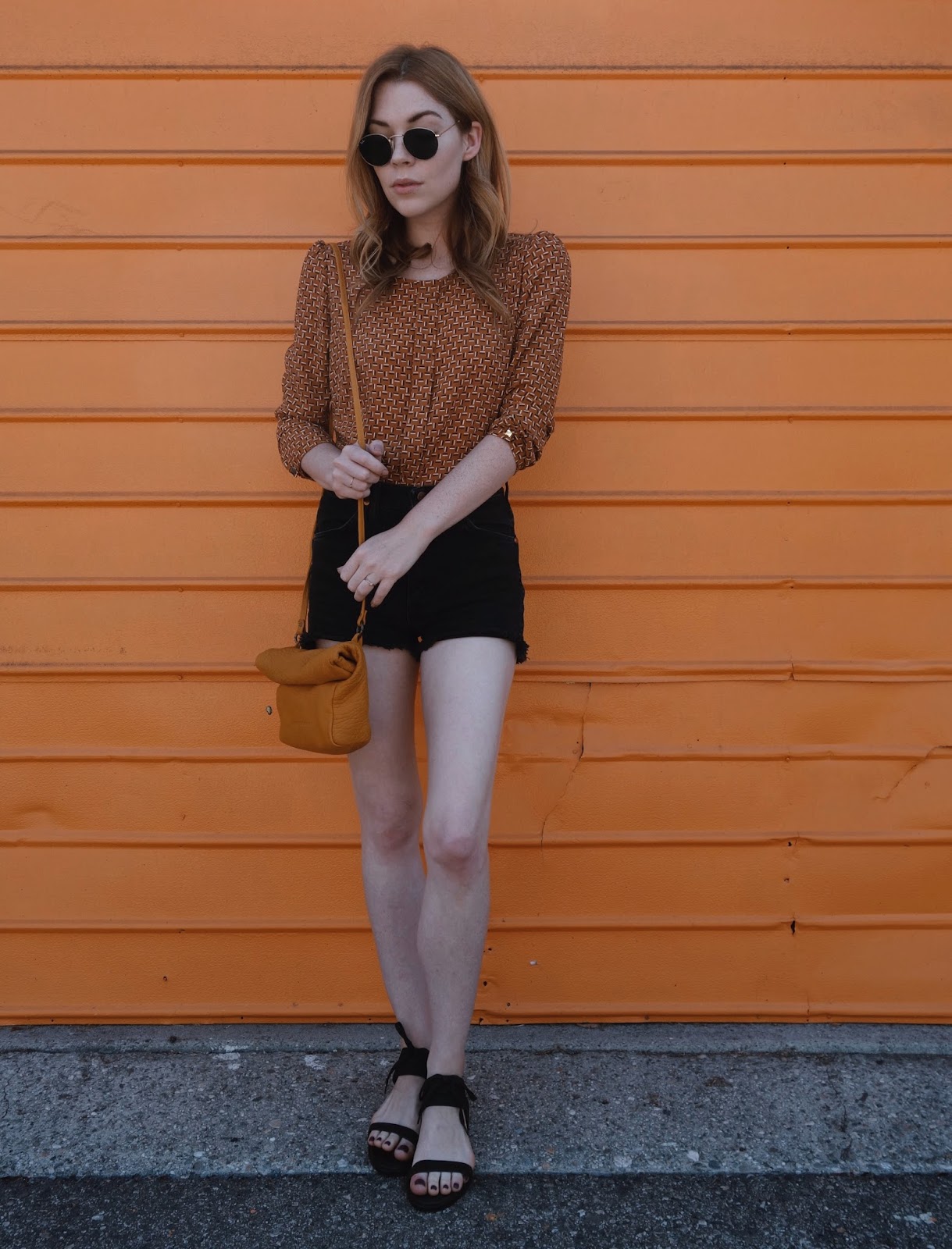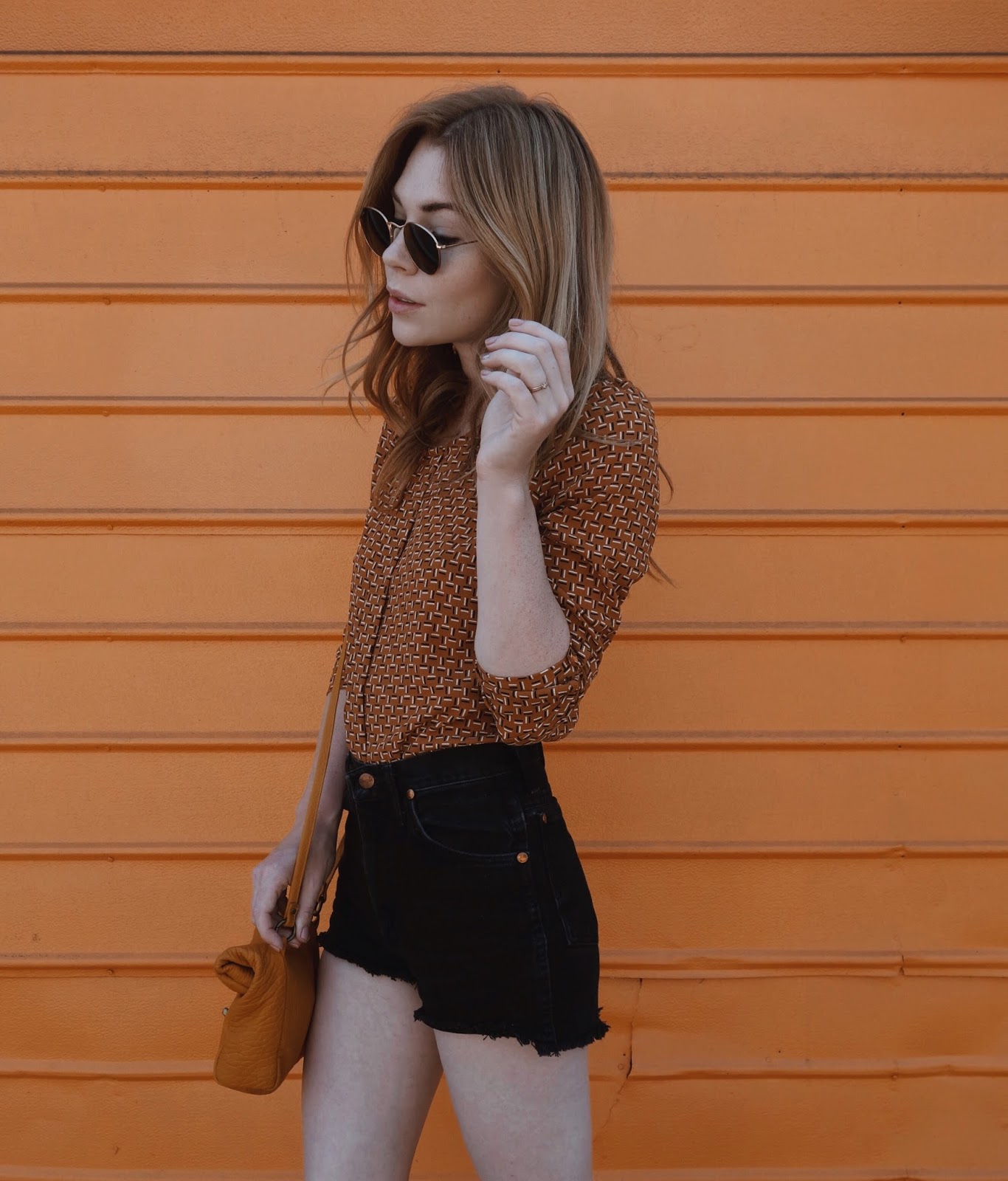 ruti shirt / vintage wrangler shorts / ruti purse / m4d3 hailey sandals