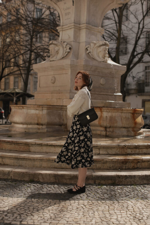 This is one of those looks that mostly exists in quick snaps + this video here, so it’s a little harder for me to show, but I still wanted to break it down. In the below image you can see how I plan my looks before leaving, so this was the photo I referenced before getting dressed for the day. The purse and the shoes changed – I ended up wearing my Carel block heels during the day and then switching to my Chanel flats in the evening (when we shot the video) but this was the foundation for the look.
